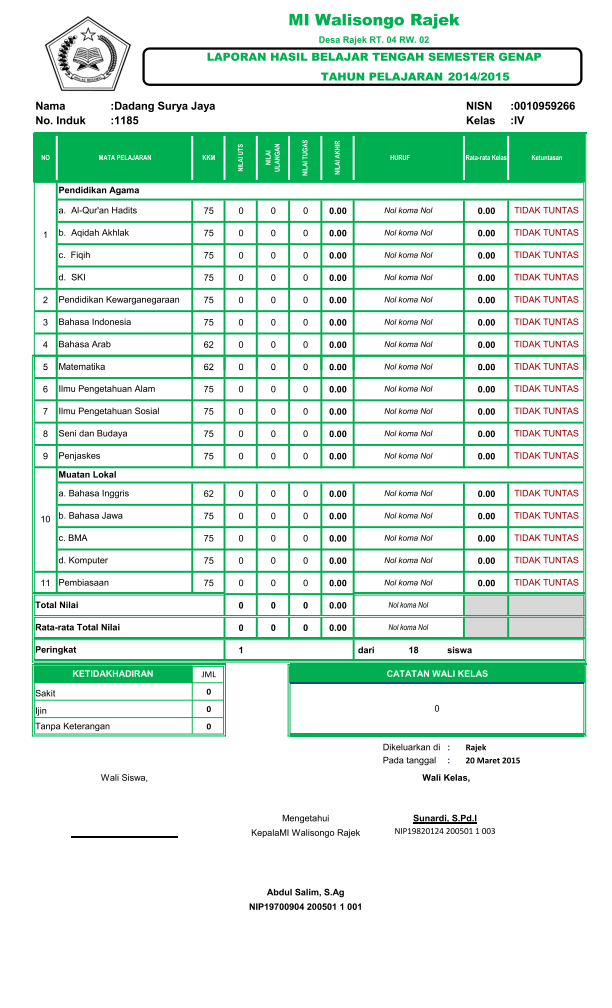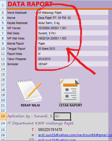 Dengan berakhirnya Ulangan Tengah Semester (UTS) Genap yang dilaksanakan kemaren tanggal 9 s.d 14 Maret 2015, kami sebagai pendidik dituntut agar dapat melaporkan hasil yang telah dicapai dalam ulangan tersebut lewat laporan yang tertulis kepada orang tua. Untuk mempermudah kerja kami maka disini akan kami bagian Aplikasi yang berbasis Microsoft Office Excell, yang mana aplikasi ini untuk mencetak semua nilai yang diperoleh siswa selama setengah semester dan berformatkan seperti Raport Semester.